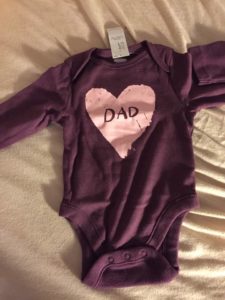 Before Alyssa died, when I was still blissfully pregnant and after I found out she was a girl, I had bought a few onesies for her. One of them was purple, with a pink heart that said “Dad” in purple letters. I loved this shirt and I thought Alyssa’s daddy would love it, too. Of course, he did. He literally would sleep with the shirt under him. Little did we know just how much this shirt would mean to us later.